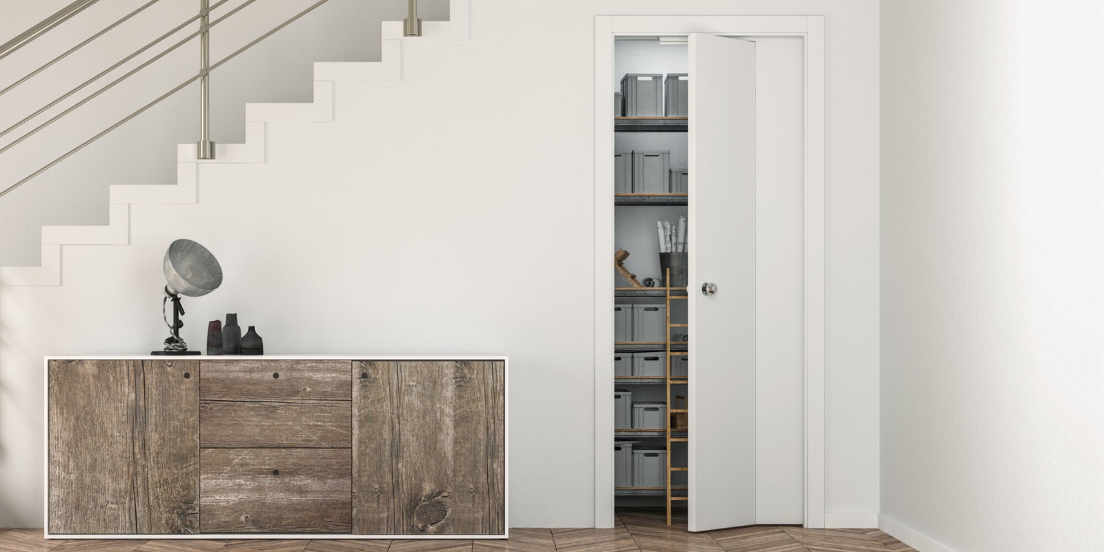 ECLISSE Novanta - пенал для секционной двери. Одна половина полотна такой двери скрывается в пенал, а вторая половина открывается как распашная. Такое решение позволяет открыть полноценный проход в помещения с малыми размерами стен.